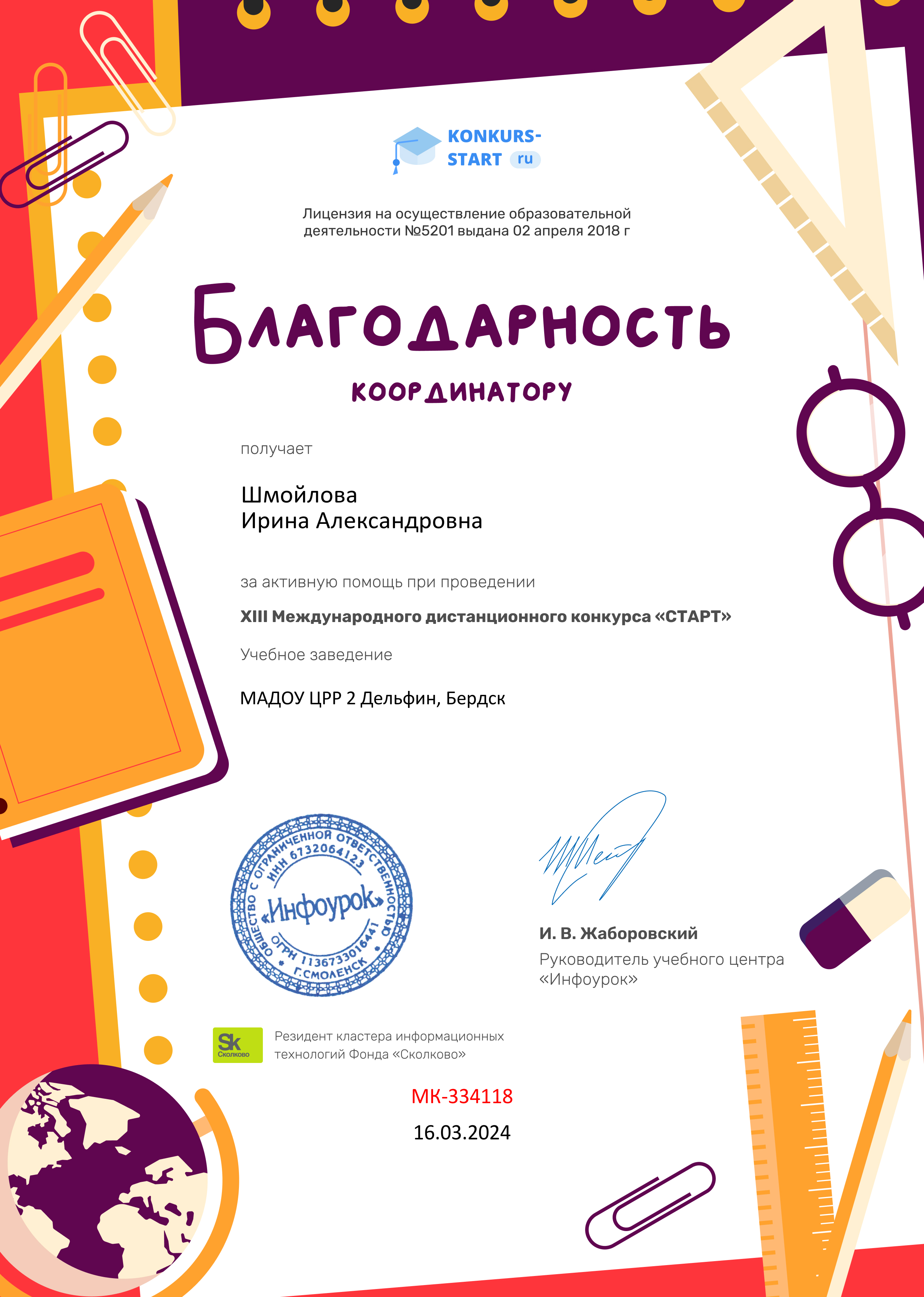 БЛАГОДАРНОСТЬ координатору за активную помощь при проведении XIII Международного дистанционного конкурса "СТАРТ"