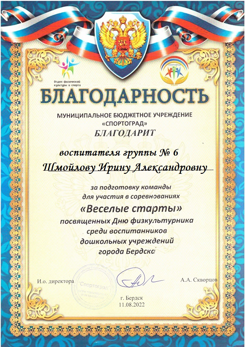 БЛАГОДАРНОСТЬ МБУ "СПОРТОГРАД" за подготовку команды для участия в соревнованиях "Весёлые старты"