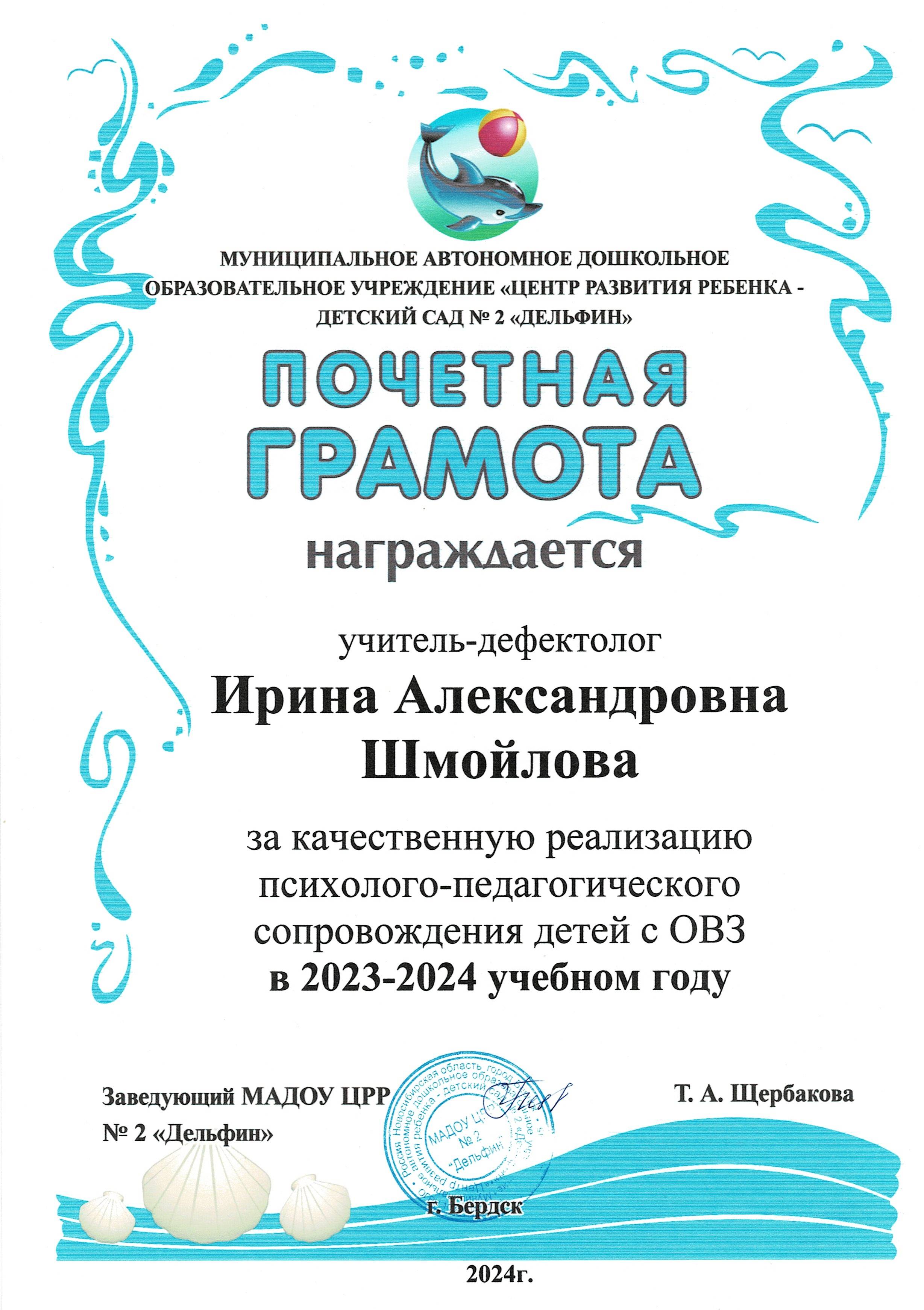 ПОЧЁТНАЯ ГРАМОТА за качественную реализацию психолого-педагогического сопровождения детей с ОВЗ в 2023-2024 учебном году