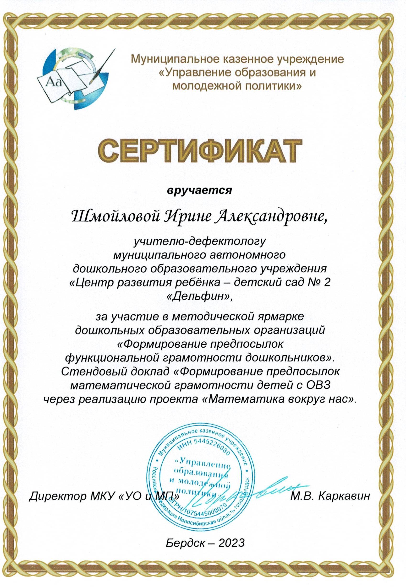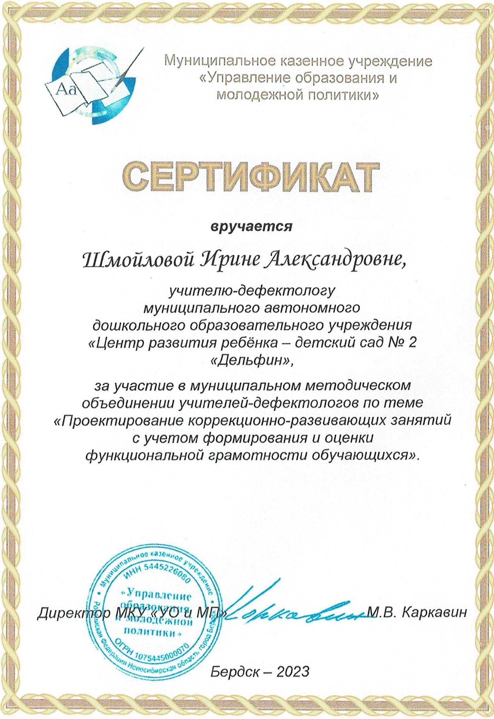 СЕРТИФИКАТ за участие в муниципальном МО учителей-дефектологов по теме "Проектирование коррекционно-развивающих занятий с учётом формирования и оценки функциональной грамотности обучающихся"