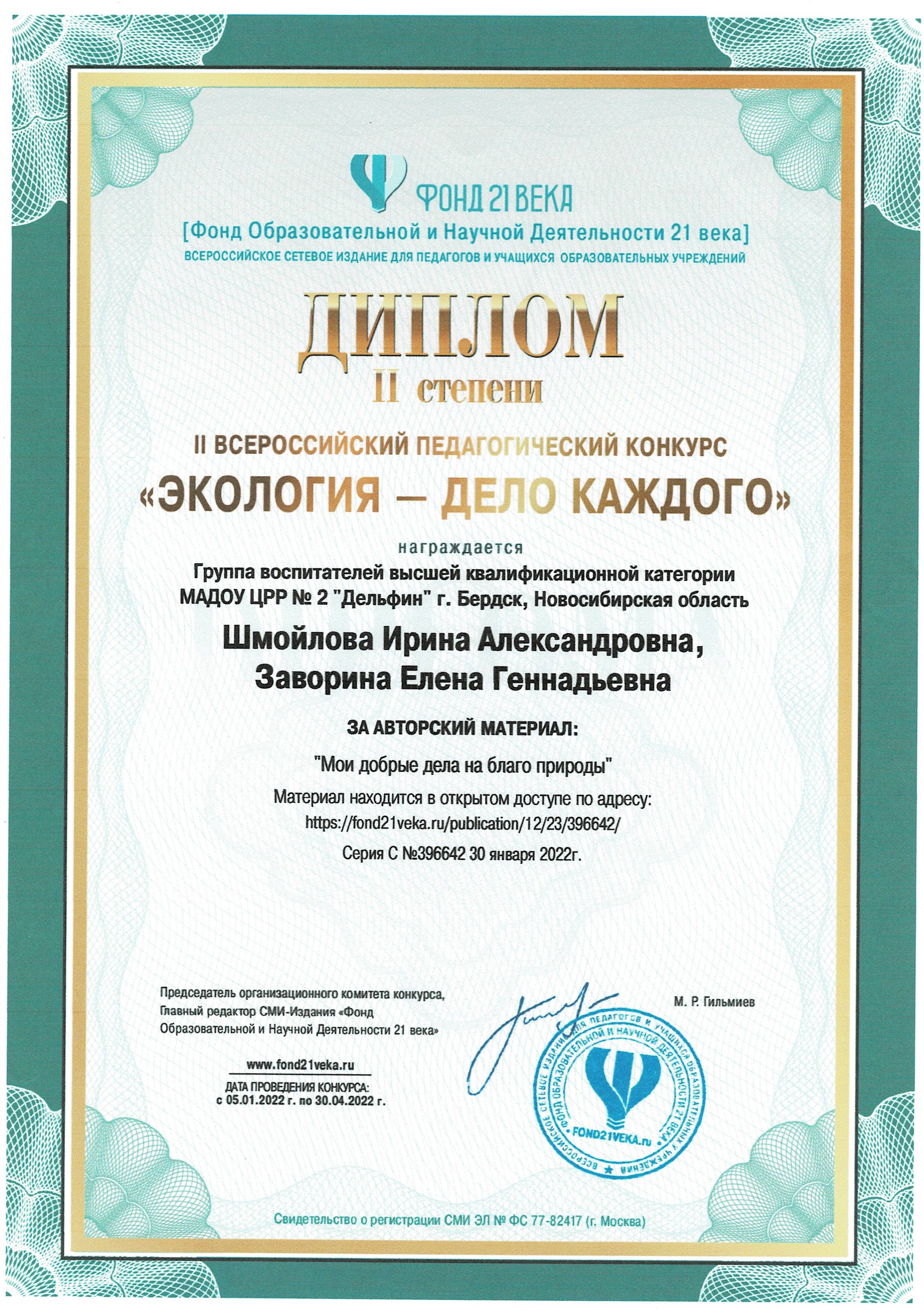 ДИПЛОМ II степени II всероссийский педагогический конкурс "Экология - дело каждого". Авторский материал "Мои добрые дела на благо природы"