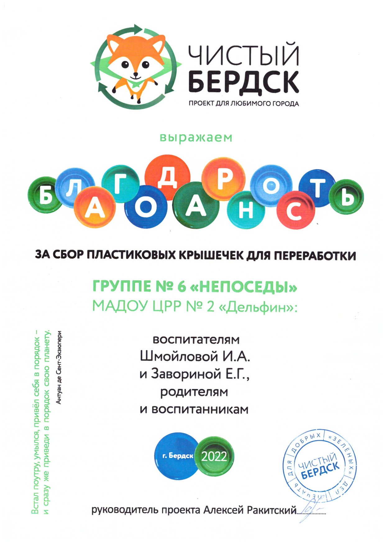 БЛАГОДАРНОСТЬ Проект для любимого города "ЧИСТЫЙ БЕРДСК" за сбор пластиковых крышечек для переработки
