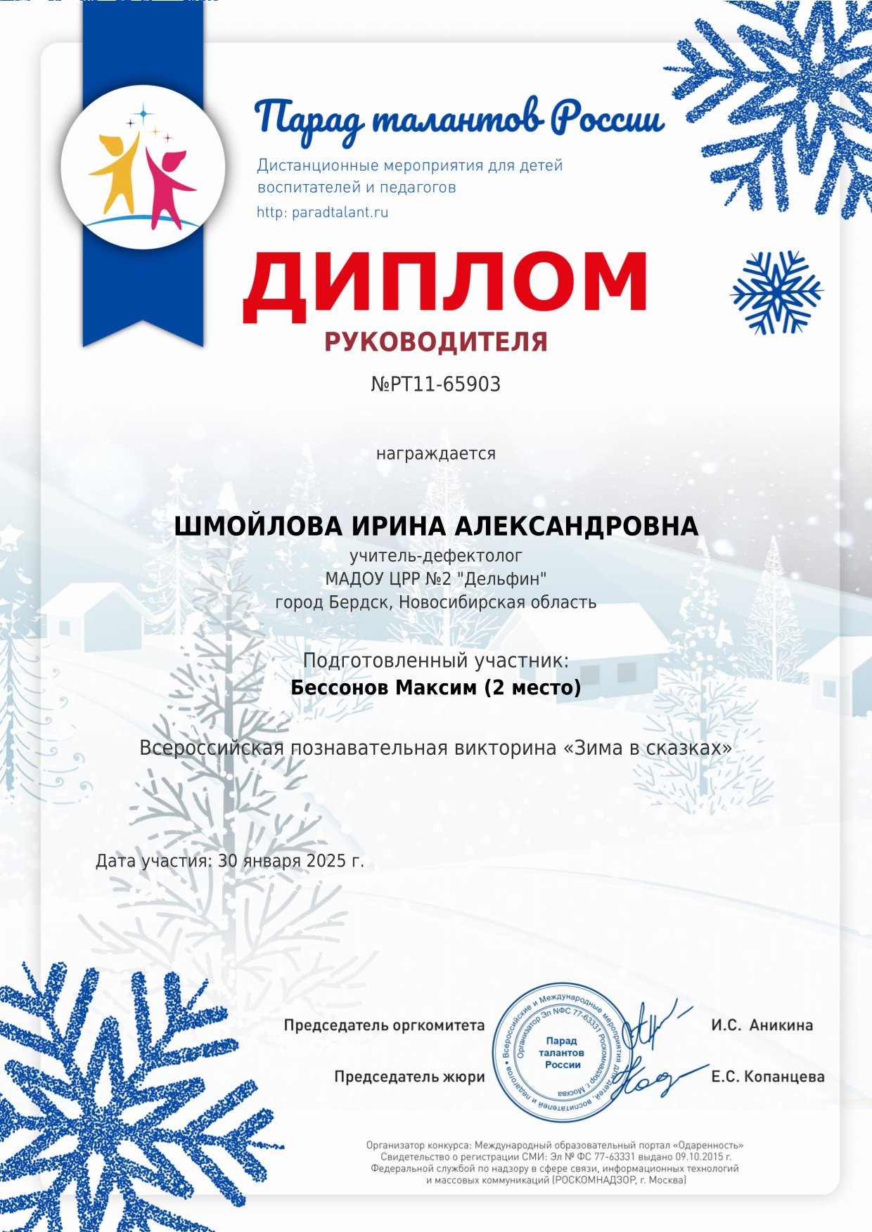 ДИПЛОМ руководителя Всероссийская познавательная викторина "Зима в сказках"