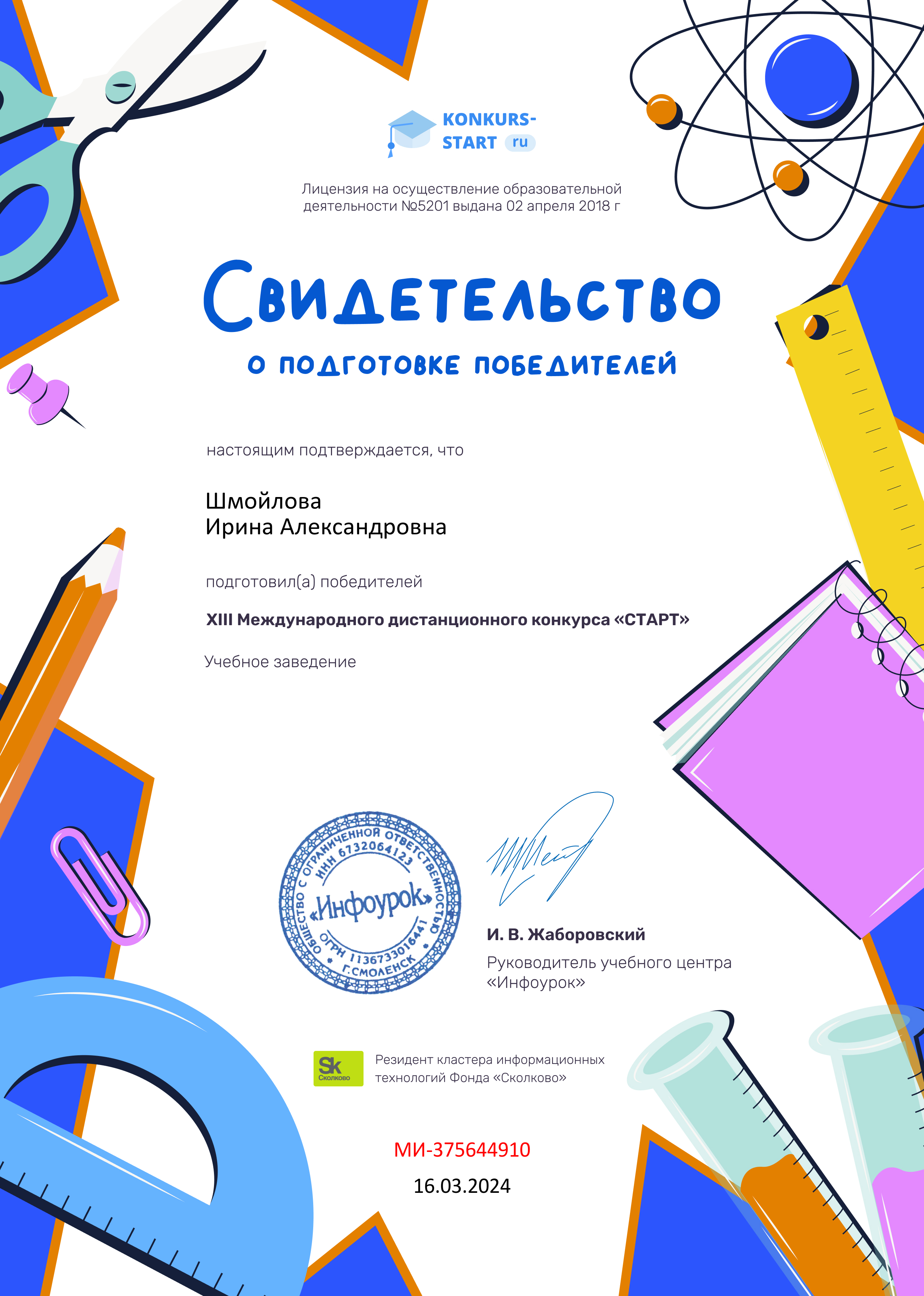СВИДЕТЕЛЬСТВО о подготовке победителей XIII Международного дистанционного конкурса "СТАРТ"