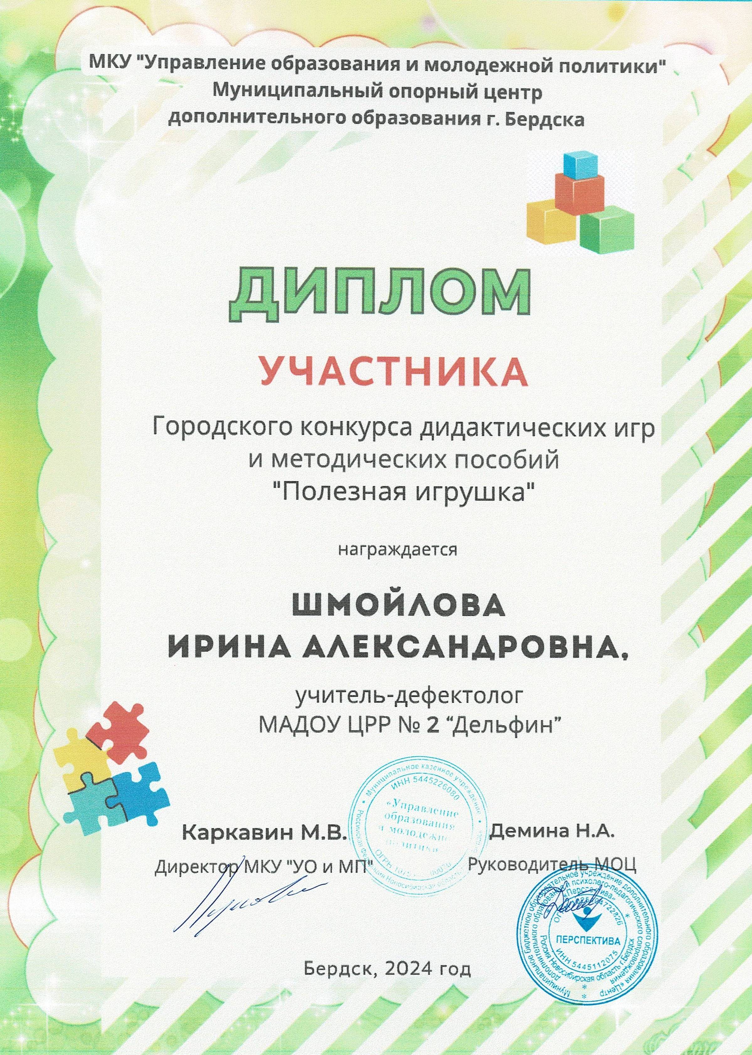 ДИПЛОМ УЧАСТНИКА Городского конкурса дидактических игр и методических пособий "Полезная игрушка"