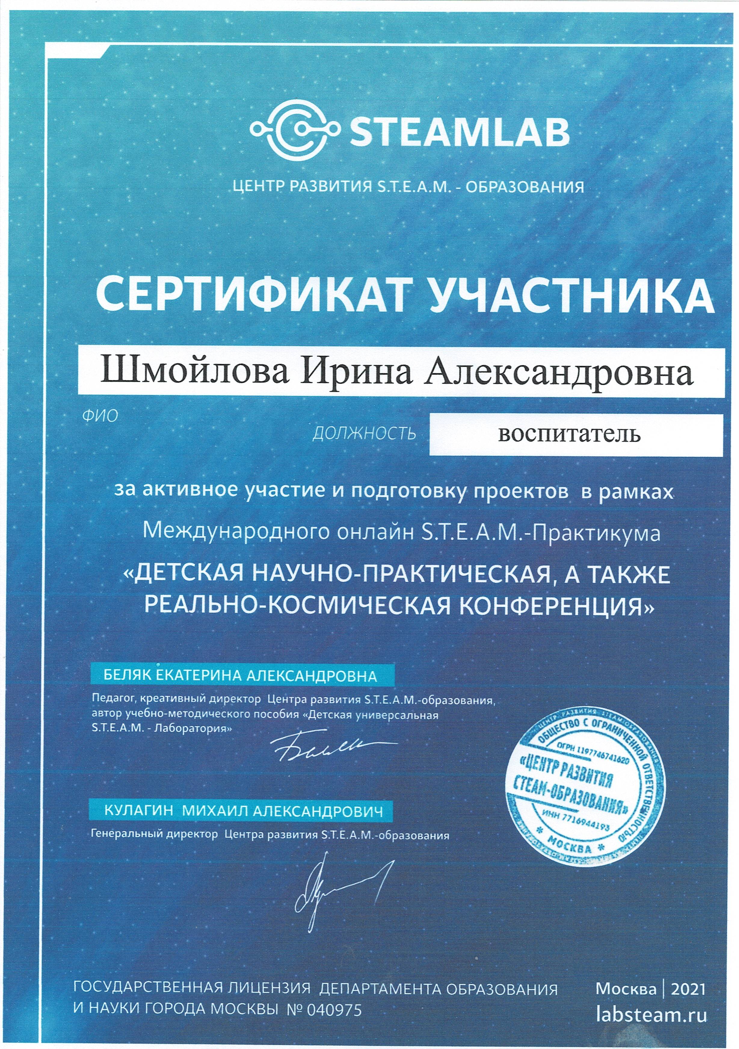 СЕРТИФИКАТ участника Международного онлайн STEAM - Практикума "Детская научно-практическая, а также реально-космическая конференция".