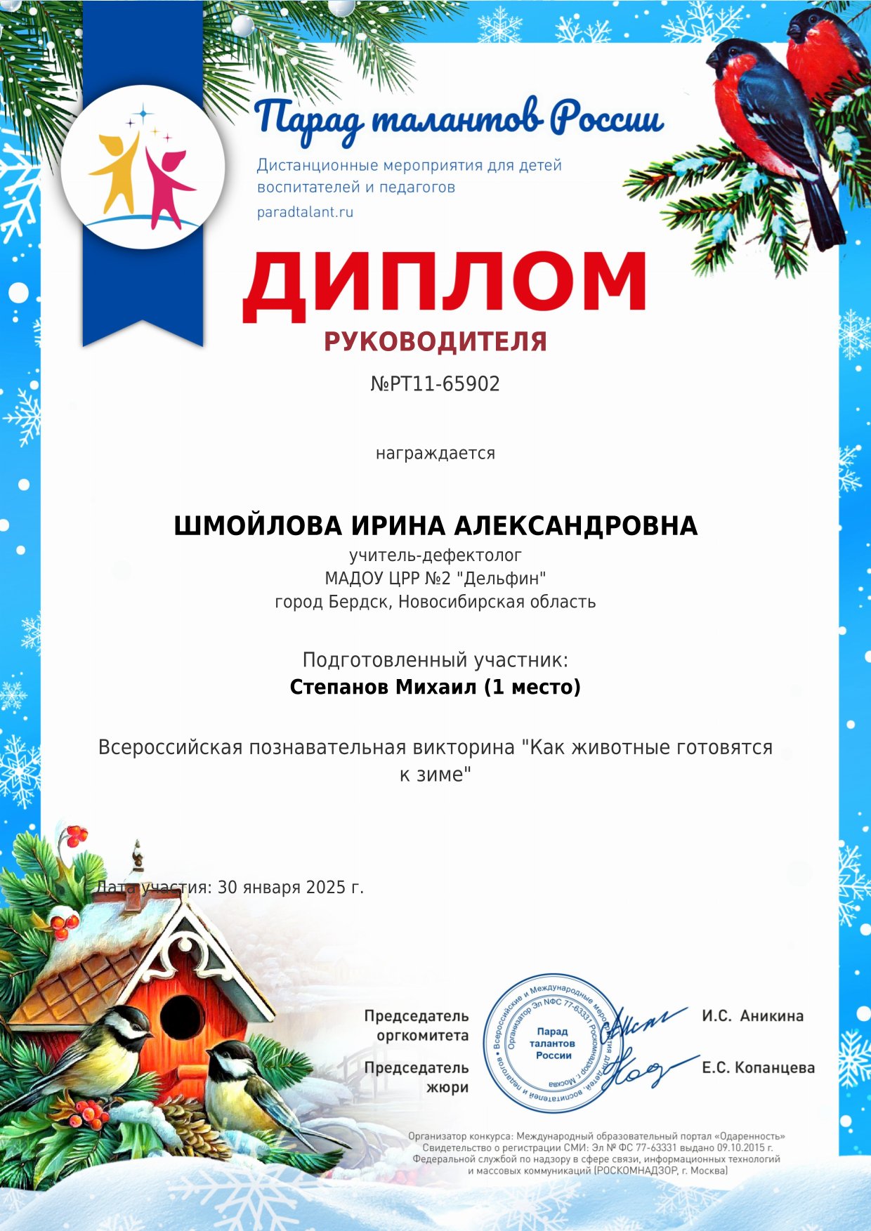 ДИПЛОМ руководителя Всероссийская познавательная викторина "Как животные готовятся к зиме"