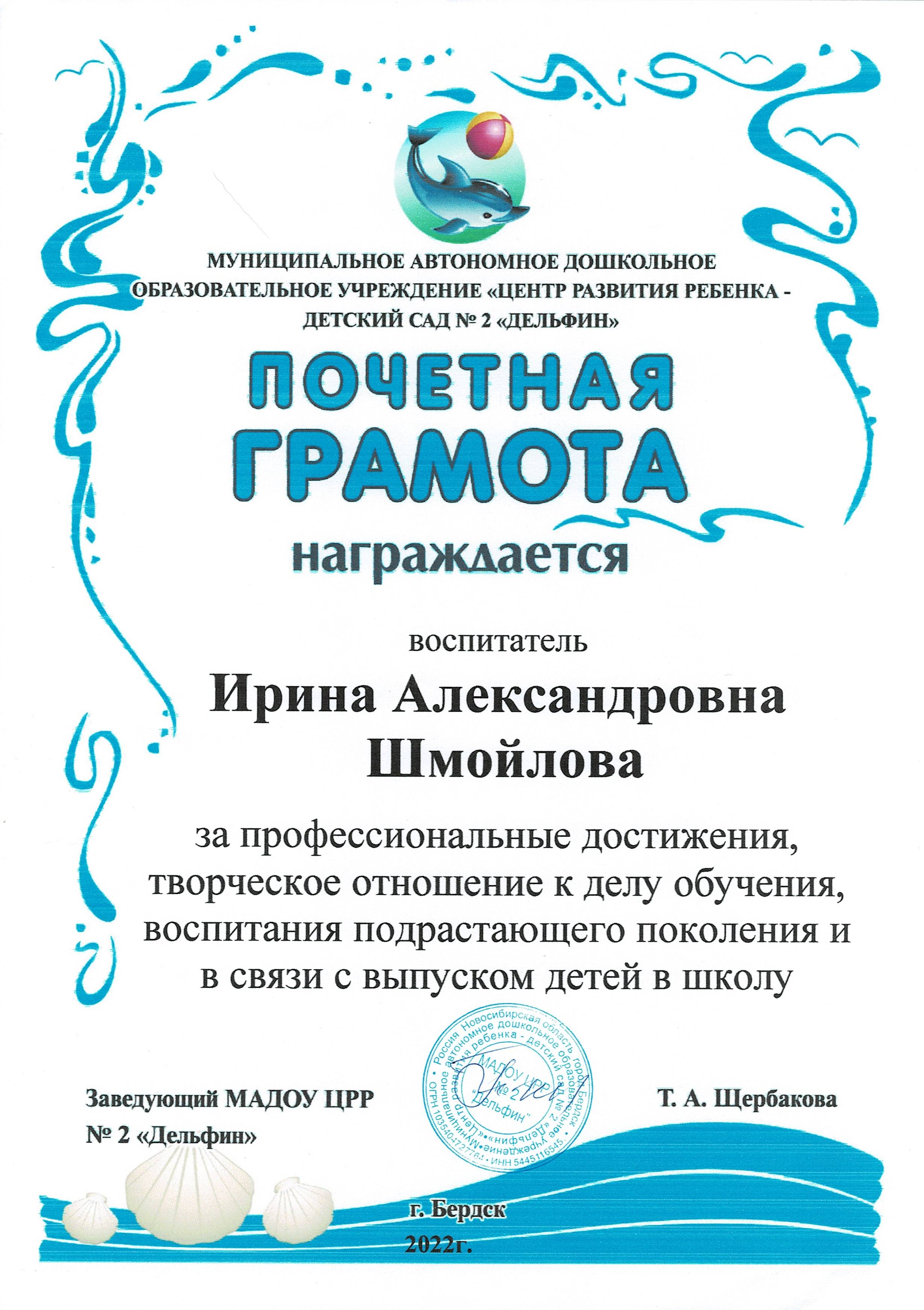 ПОЧЁТНАЯ ГРАМОТА за профессиональные достижения, творческое отношение к делу обучения, воспитания подрастающего поколения и в связи с выпуском детей в школу