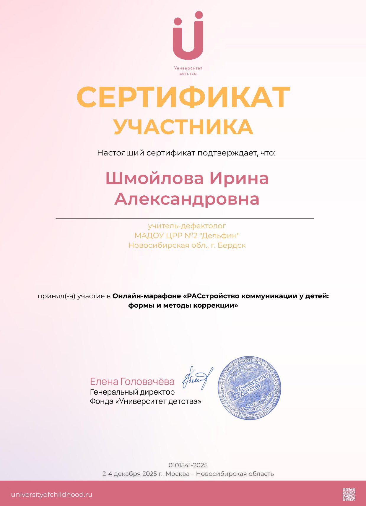 СЕРТИФИКАТ участника онлайн-марафона "РАСстройства коммуникации у детей: формы и методы коррекции"