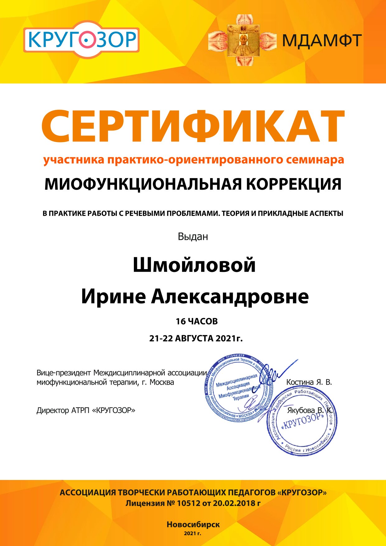 СЕРТИФИКАТ участника практико-ориентированного семинара "Миофункциональная коррекция в практике работы с речевыми проблемами. Теория и прикладные аспекты"