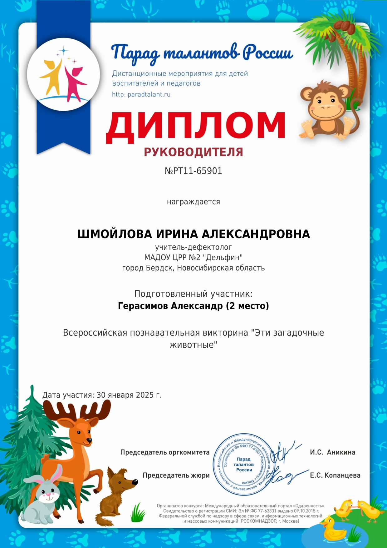 ДИПЛОМ руководителя Всероссийская познавательная викторина "Эти загадочные животные"