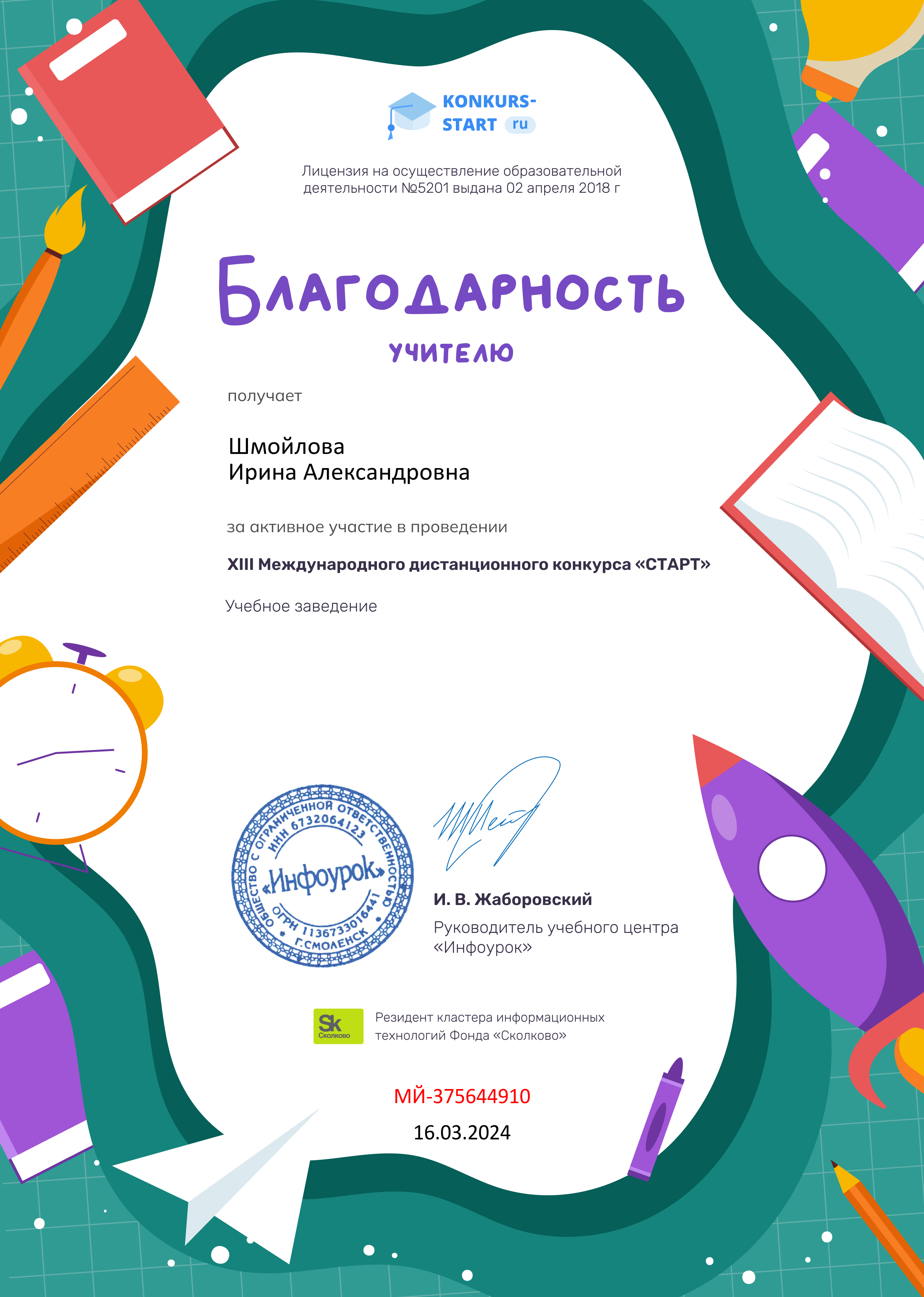 БЛАГОДАРНОСТЬ за активное участие в проведении XIII Международного дистанционного конкурса "СТАРТ"