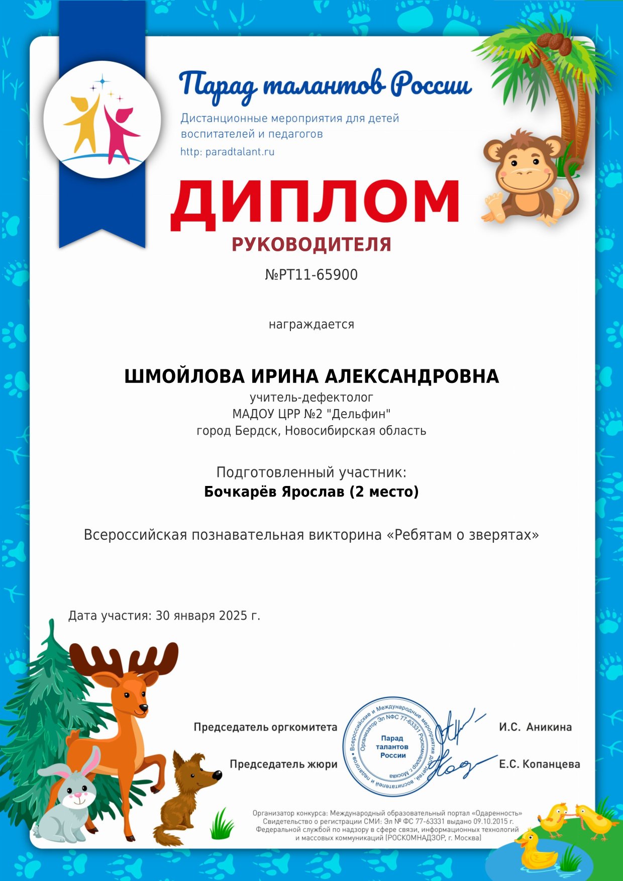 ДИПЛОМ руководителя Всероссийская познавательная викторина "Ребятам о зверятах"