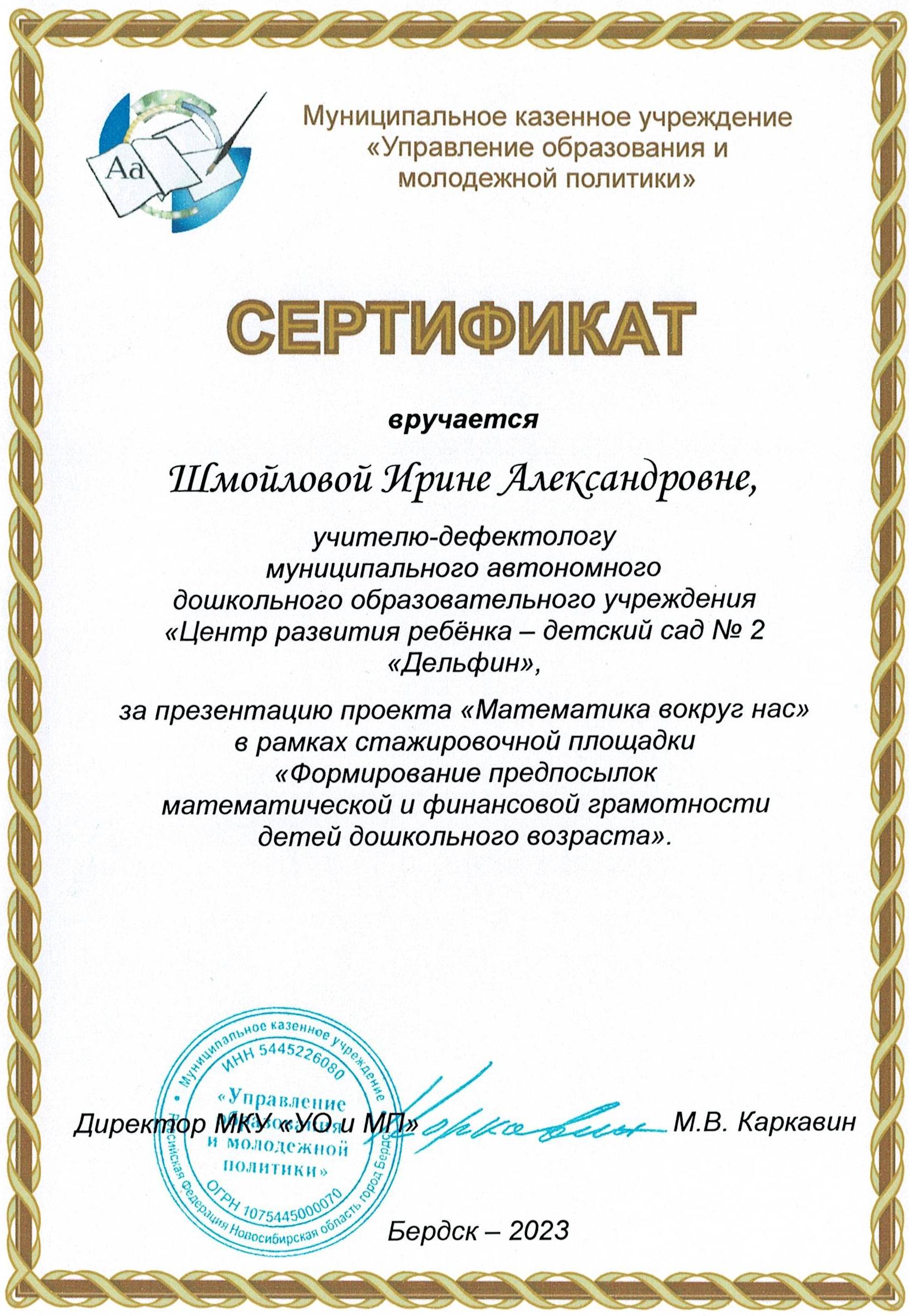 СЕРТИФИКАТ за презентацию проекта "Математика вокруг нас" в рамках стажировочной площадки "Формирование предпосылок математической и финансовой грамотности детей дошкольного возраста"